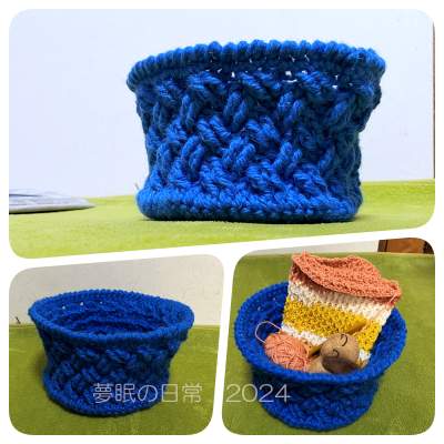 このブルーの毛糸、解いたリサイクル品なんだけど