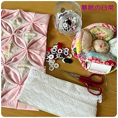お花のボタンとレースを使って可愛く出来たら良いな~