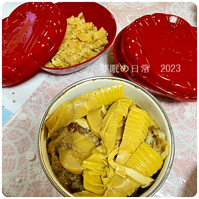 たけのこご飯にタケノコの煮物、お弁当箱が可愛い。