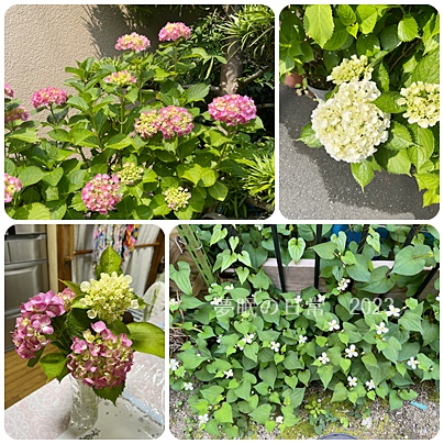 近所の角のお家、毎年見事なアジサイが何種類も咲きます。