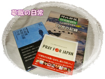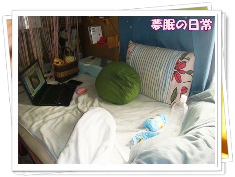 読みかけの本に編み物、ペットボトルの水、ひざ掛け代わりのバスタオル。