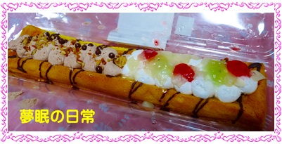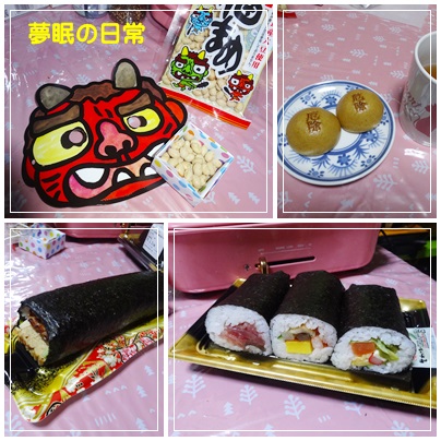 恵方巻きに見立てた?スイーツを買ってきておやつに3人で頂きました。
