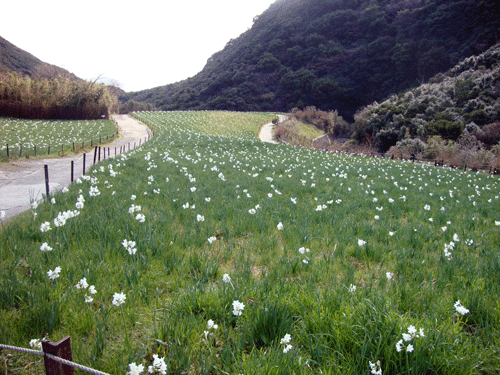 灘黒岩水仙郷は天然の水仙が山肌に見事に咲き誇ります。