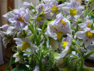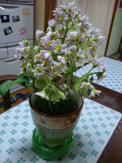 雨の中、パパリンは綺麗だからとジャガイモの花を摘んできました。