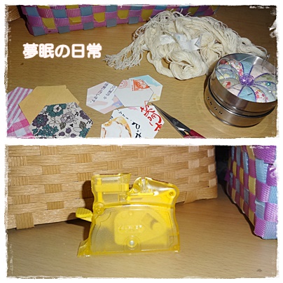 カットした年賀状を気分が乗った時にチクチク布で包んでますが