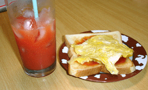 ケチャップでは無くトマトジャムを塗って卵焼き?を乗せて食す。