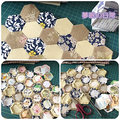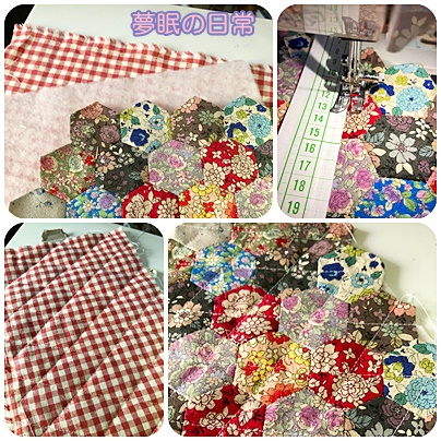 繋いだ六角形とキルト綿、裏生地を重ねて